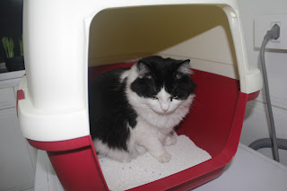 Depois que todo mundo experimentou a caixa ( menos a Juju que não quis entrar), ela colocou em cima da máquina de lavar, perto do tanque ( local atual do número 2), e encheu de areia. Ligou o Feliway na tomada que fica perto. Colocou umas gotinhas do floral na água. Rezou para dar tudo certo e me colocou perto para conhecer o ambiente.